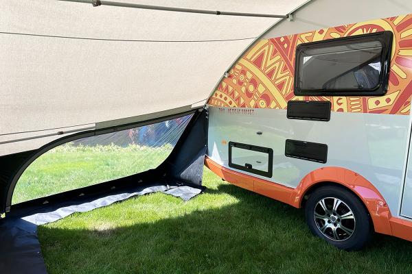 Das T@B Sonnendach Plus wurde speziell für die einzigartige Form des T@B Wohnwagens entworfen und bietet viel Schatten und Schutz in einem stilvollen und funktionellen Design. Für ein gutes Raumgefühl sorgt die Tiefe von 250 cm.