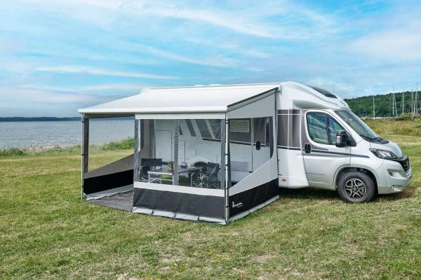 For ekstra læ kan du kombinere Wind Side med en Wind Front, der også nemt monteres i campingvognens/køretøjets markise.