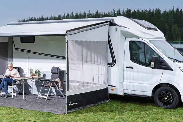 Shade Side è un pannello laterale con un'ampia finestra a rete che fa ombra dal sole e garantisce una buona circolazione dell'aria. Grazie alle tre ventose che lo fissano al caravan/veicolo, il pannello è ben aderente e impedisce la formazione di correnti d'aria. Il pannello laterale è realizzato in resistente tessuto di poliestere spalmato, che garantisce longevità e resistenza al meteo.