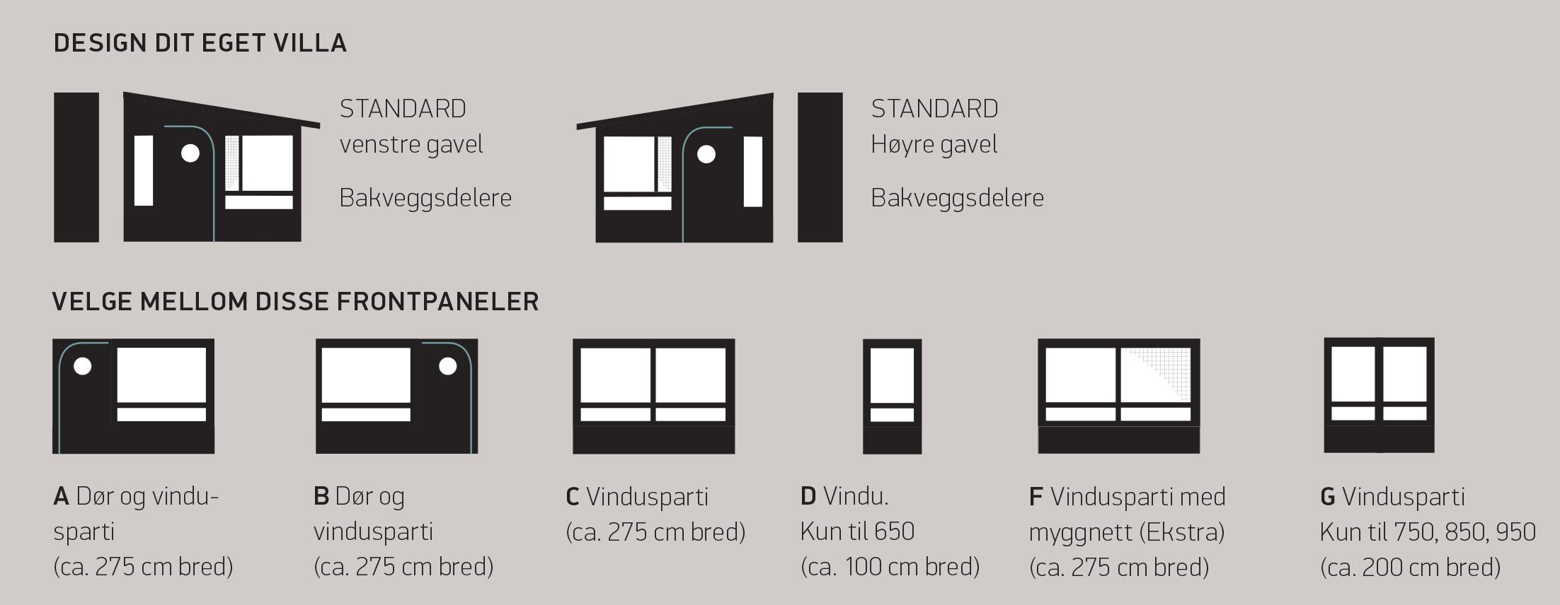 VILLA er tilgjengelig i to dybder, fem lengder og bygges opp av forskjellige moduler. Med de mange valgmulighetene kan du selv designe din egen drømme-VILLA: