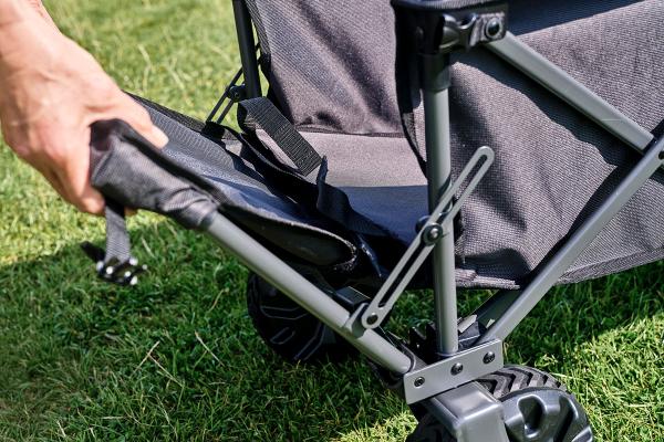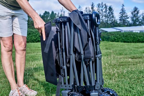 The cargo space measures 92 x 48 x 36 cm (approximately 159 litres). The Beach Trolley weighs 11 kg and can carry up to 50 kg. The base is detachable for stability in use and can be easily removed when folding the trolley down. Folded, it measures just 42 x 28 x 77 cm.