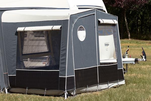 The large windows at the front and rear, together with the side window with ventilation, provide excellent natural light and a comfortable indoor climate. The door can be rolled to the side for additional ventilation or left permanently open. External window blinds allow you to screen off from view and create extra privacy. The side panel between the annex and the awning can be zipped back into place, so you can close off the annex from the rest of the awning.