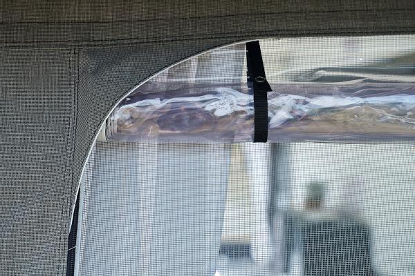 Two large side ventilation windows with mosquito nets, corner door right front, two door options.