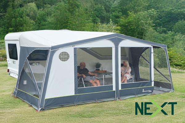 The front panels have zips that fit the zip sewn into the awning. Zip down the front and you have the possibility of a veranda solution. The front panels have two doors and large windows.