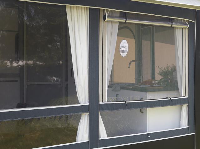 The rear wall of the VILLA can be adjusted to fit caravans of all sizes. This ensures a tight and precise fit and allows you to use the awning freestanding without a caravan.
